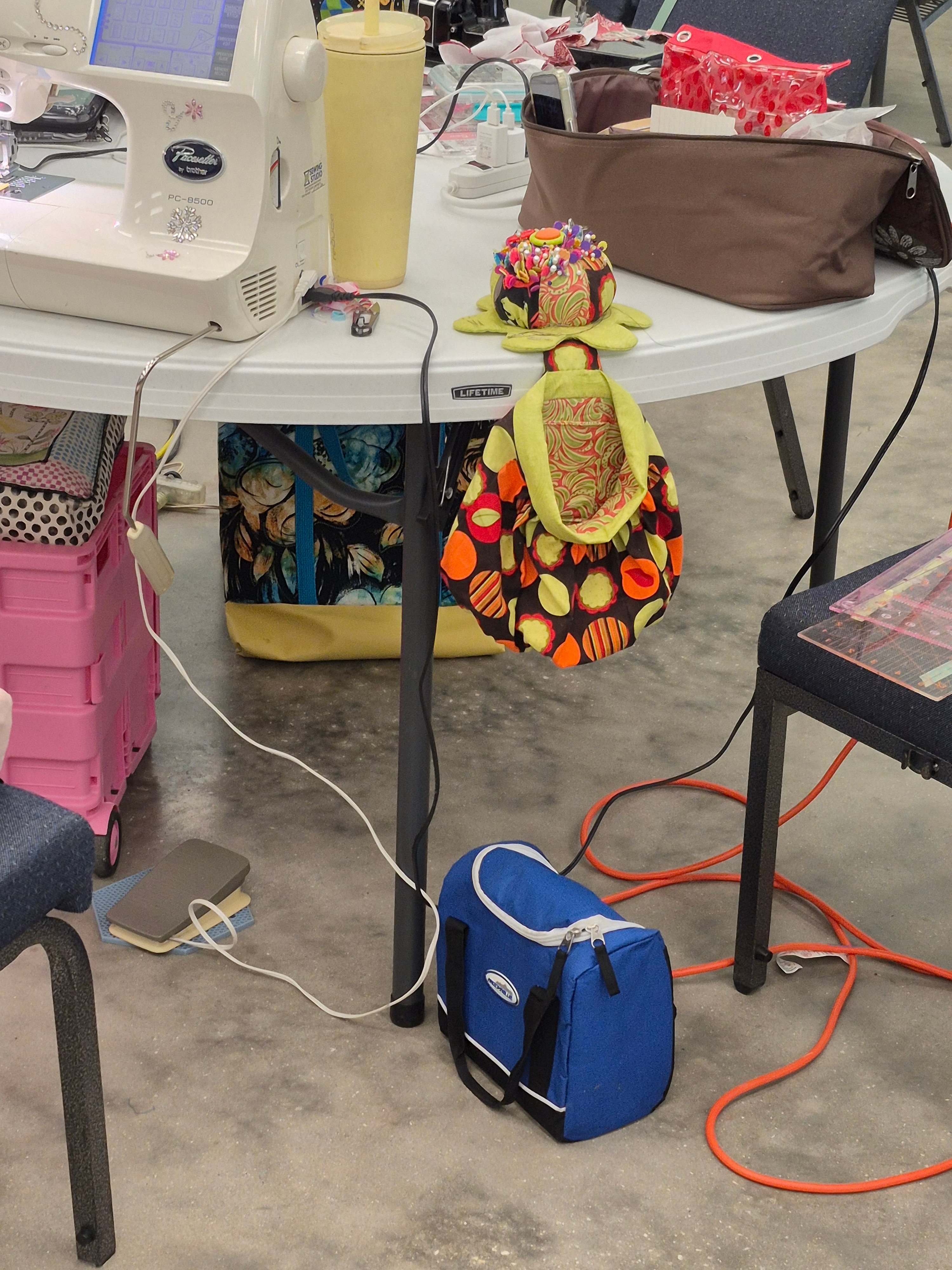 Beside the sewing machine at this particular station sat a pincushion of such flamboyant personality, bursting with pins in every color, perched atop what appeared to be a handmade fabric creature in a swirling green-and-orange print that this author felt certain was not merely a tool but a mascot.